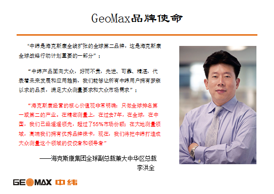 作为海克斯康测量产业集团旗下品牌,GeoMax是海克斯康全球重点发展的业务单元,成立"中纬"公司,是海克斯康进军全球大众测量仪器市场的重要举措。秉承欧洲精湛的制造工艺和理念,共享海克斯康全球领先技术,优化的成本组合,使GeoMax产品具有绝对的品质优和极具竞争力的价格。”中纬“现有产品包括全站仪、GPS定位系统、三维扫描仪、数字水准仪、光学水准仪、激光类设备等全系列测量产品和解决方案,所有产品都具备独有的竞争优势。